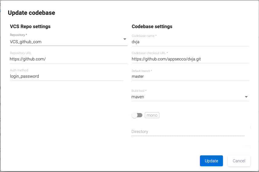 Измените параметры кодовой базы, как описано выше, и нажмите кнопку Update.