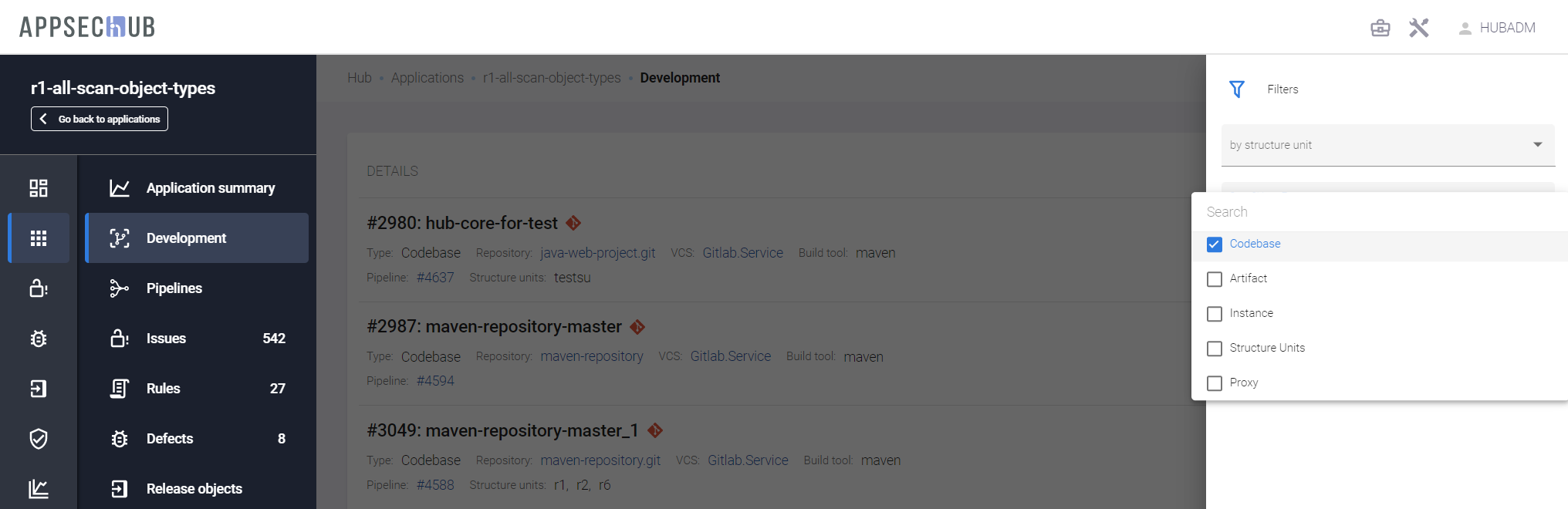 Кроме того, с помощью поля by structure unit можно поставить дополнительный фильтр на структурные единицы приложения.