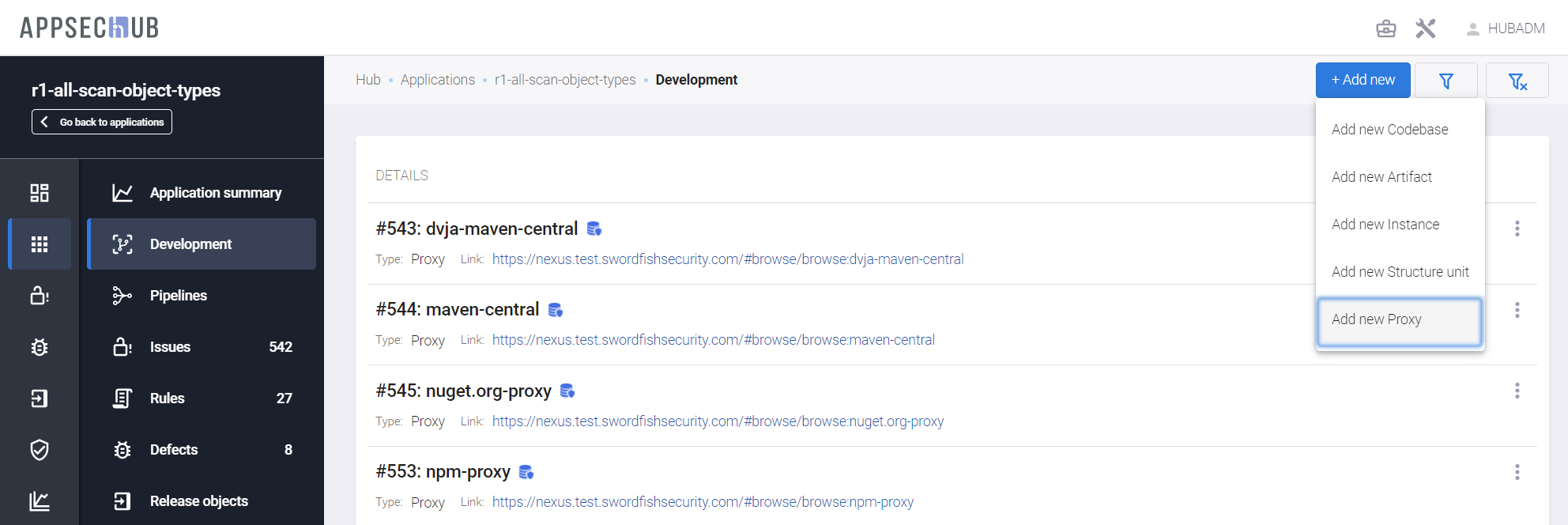 Выберите слева пункт меню Development, нажмите кнопку Show filters в правом верхнем углу страницы и в поле Scan Objects Type выберите Proxy. На странице отобразятся прокси-репозитории.