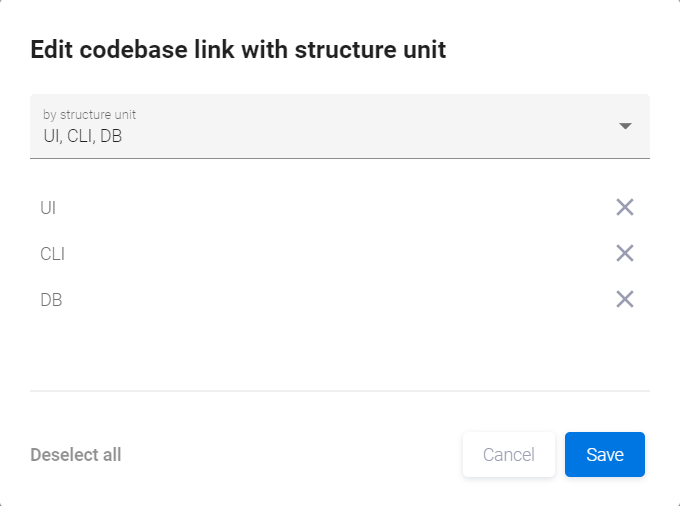 Используйте пункт меню Edit link to structure unit расположенного справа в конце строки кодовой базы, артефакта или экземпляра приложения выпадающего меню «», чтобы отнести этот элемент к структурной единице. На экране появится соответствующее окно Edit link with structure unit. Выберите структурную единицу из выпадающего меню и нажмите кнопку Save. Чтобы удалить элемент из структурной единицы, нажмите на кнопку справа от ее названия.