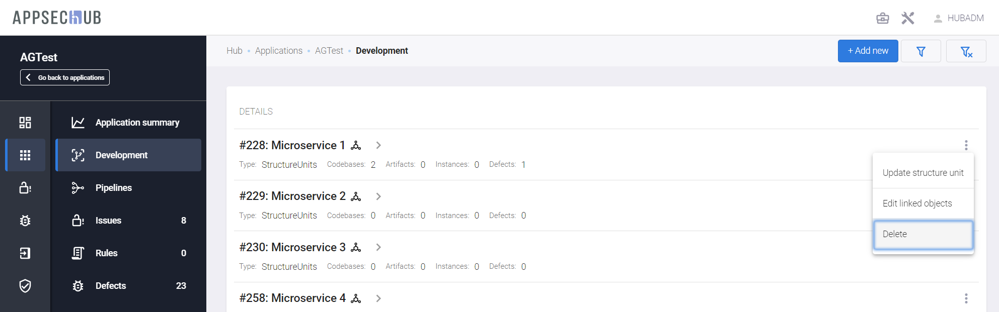 Для удаления структурной единицы справа в конце строки выбранной структурной единицы в выпадающем меню «» выберите пункт Delete. При этом будут удалены все ранее сделанные в системе привязки кодовых баз, артефактов, экземпляров приложений и дефектов к этой структурной единице.