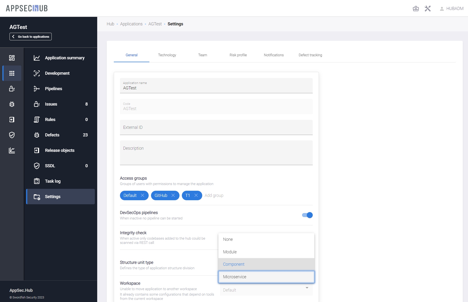 Возможность определения типа структурной единицы позволяет настроить работу с приложением в AppSec.Hub под структуру приложения (модули, компоненты или микросервисы). Например, если приложение имеет микросервисную архитектуру, целесообразно выбрать Microservice в разделе Structure unit type на вкладке General.