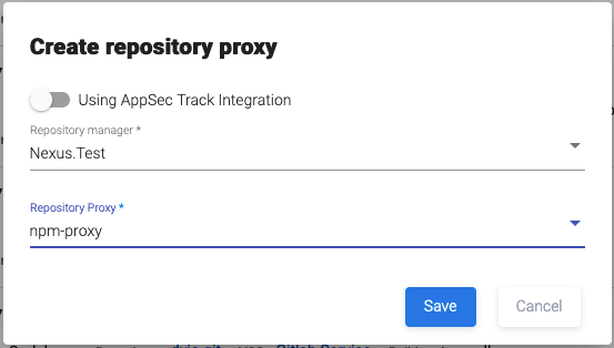 В появившемся окне Create repository proxy в зависимости от типа создаваемого прокси-репозитория включите или выключите переключатель Using AppSec.Track Integration.