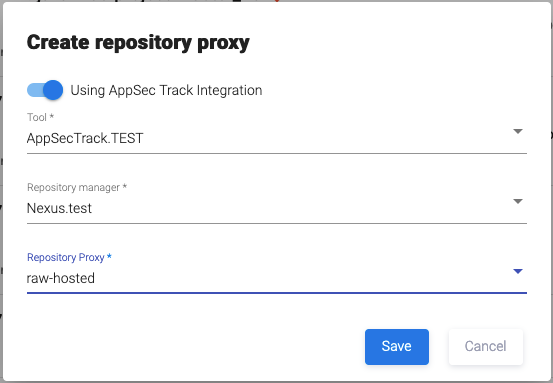 Для прокси-репозитория AppSec.Track в поле Tool выберите инструмент, в поле Repository Manager выберите менеджер репозиториев, в поле Repository proxy — репозиторий и нажмите на кнопку Save.