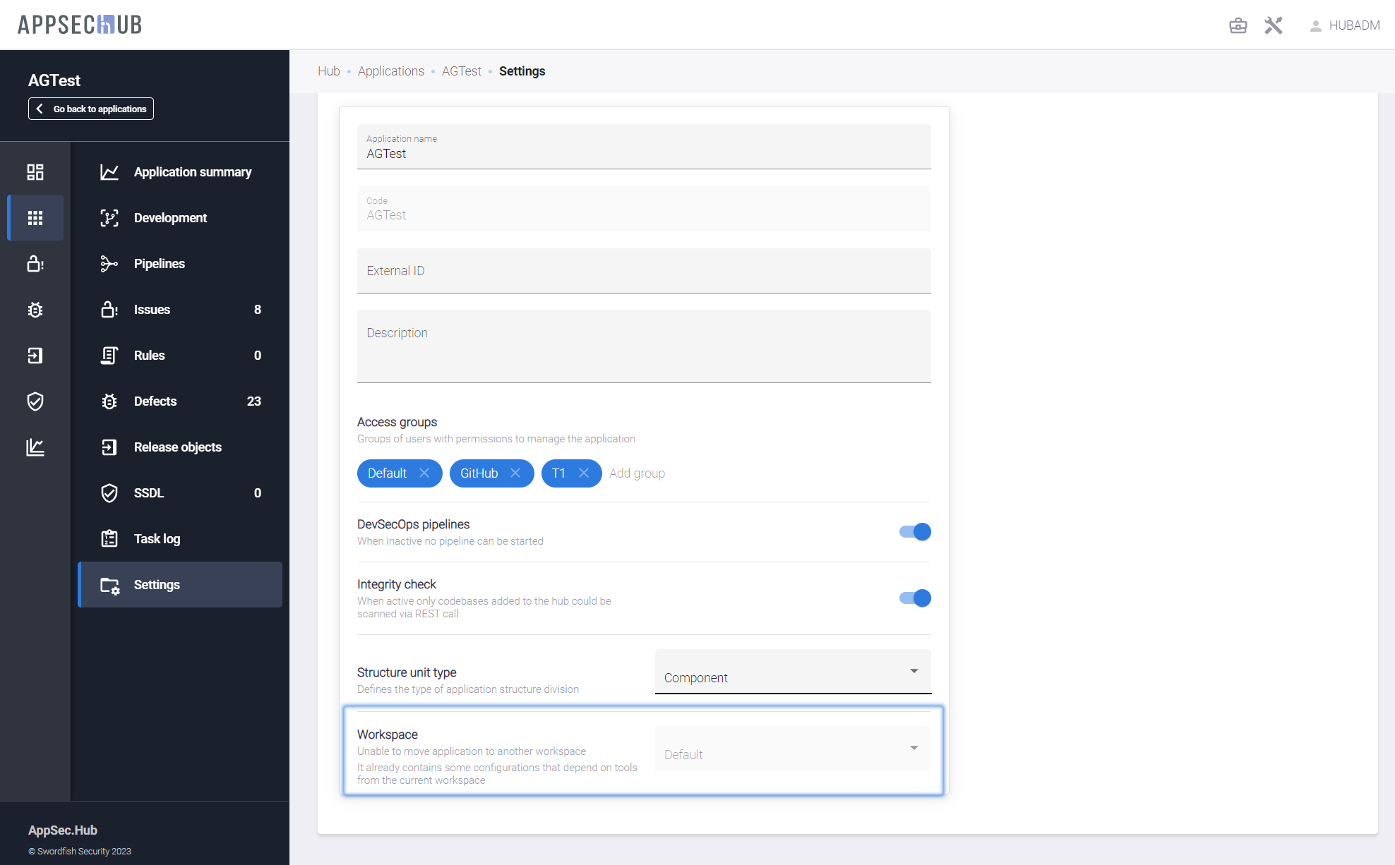 Каждое приложение в AppSec.Hub сопоставляется с рабочим пространством. Более подробная информация о рабочих пространствах приведена в разделе «Организация рабочих пространств» Руководства администратора. В AppSec.Hub всегда существует предустановленное рабочее пространство Default workspace. До момента создания других рабочих пространств в системе все приложения могут быть сопоставлены только с этим рабочим пространством. По умолчанию, в процессе создания в окне Create application приложение сопоставляется с рабочим пространством Default workspace. При создании приложения существует возможность сопоставить его с другим ранее созданным рабочим пространством при условии, что создающий приложение пользователь имеет к нему доступ.