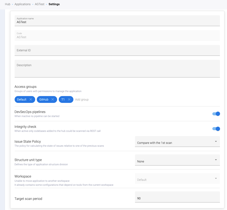 - Target scan period — целевой период сканирования приложения, устанавливаемый в днях (по умолчанию - 90 дней). Используется для оценки регулярности сканирования и визуализации метрики «Применение практик ИБ».