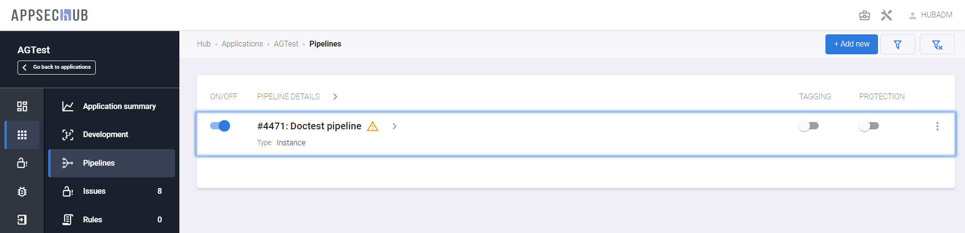 Для создания пайплайна экземпляра приложения, выберите элемент меню Pipelines в консоли слева, а затем нажмите кнопку +Add new в правом вернем углу и выберите пункт Instance pipeline из выпадающего меню.
