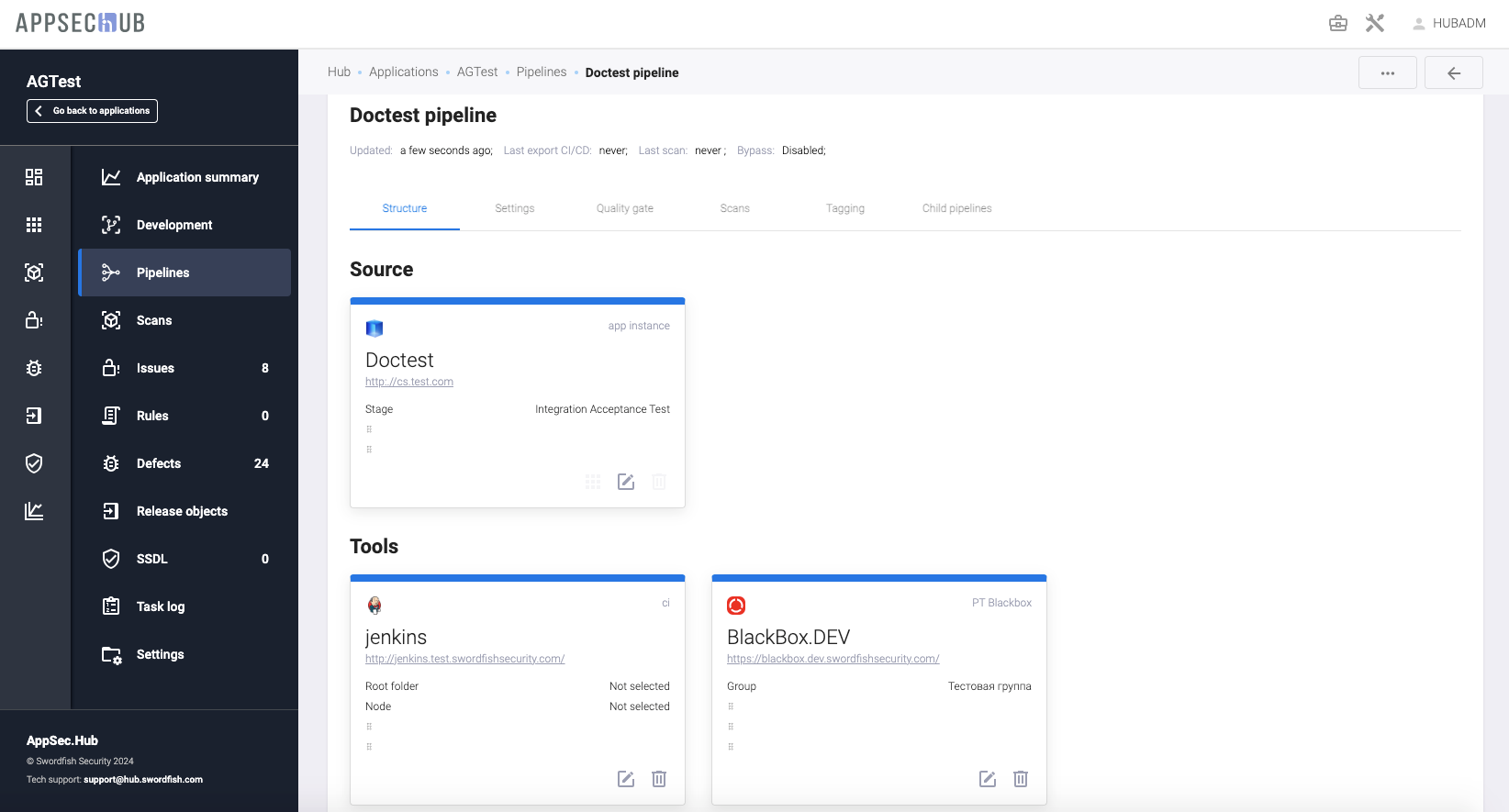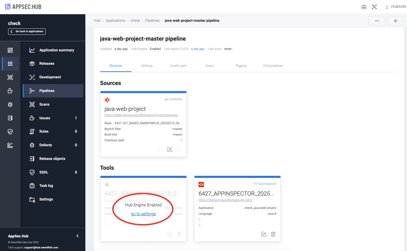 В пайплайне можно использовать или внешний инструмент CI/CD, например Jenkins, или внутренние агенты сканирований - Hub Engine. Hub Engine является частью AppSec.Hub.