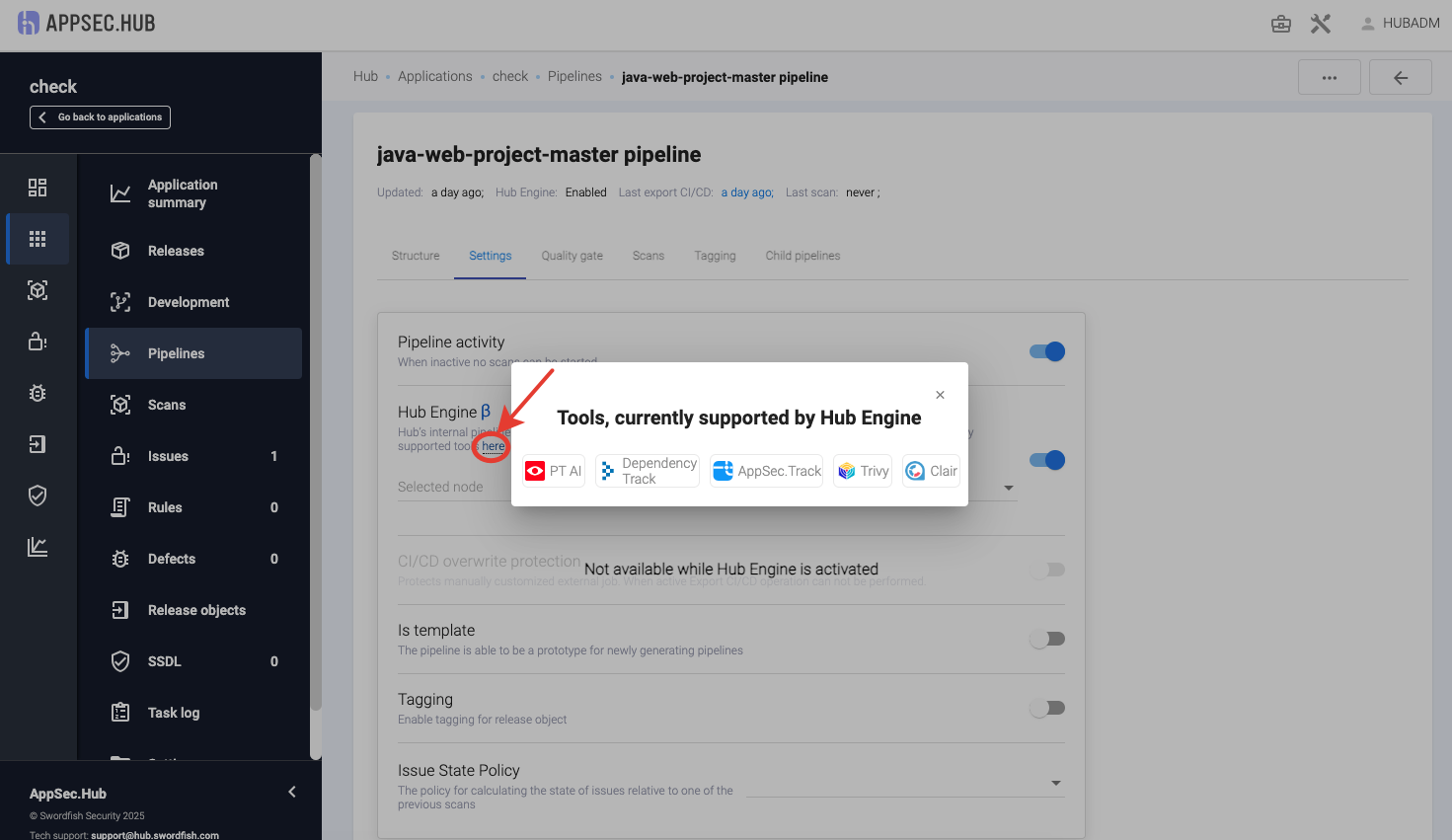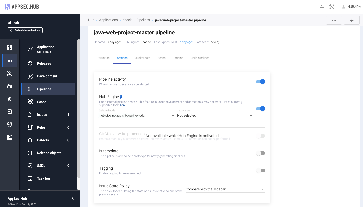 Включите переключатель Hub Engine, расположенный на вкладке Settings пайплайна.
