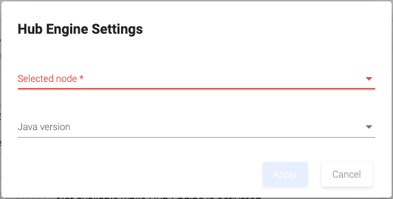 В появившемся окне Hub Engine Settings в поле Selected node выберите ноду Hub Engine из выпадающего списка. Кроме того, в поле Java version можно указать версию Java (необязательный параметр).