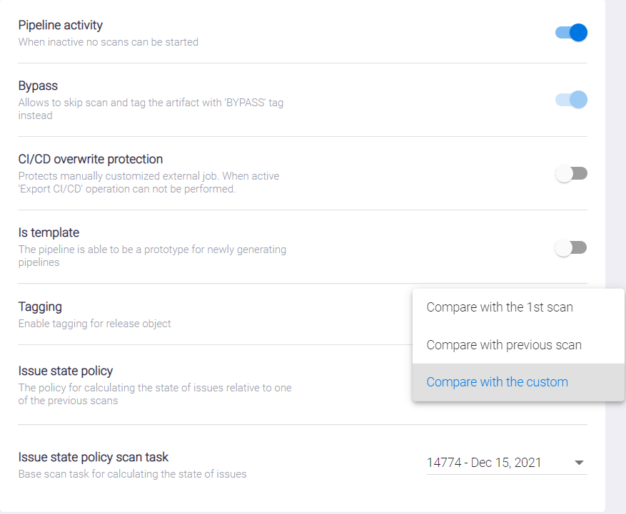 - Compare with the custom — определять состояние обнаруживаемых проблем безопасности в сравнении с результатами произвольного успешного сканирования. При выборе этого варианта на вкладке Settings настроек пайплайнов появляется дополнительное поле Issue state policy scan task, в котором необходимо указать соответствующее сканирование.