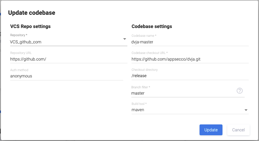 - Используемый инструмент VCS (Version Control System, система управления версиями), URL кодовой базы, тип ветки кода, инструмент сборки.