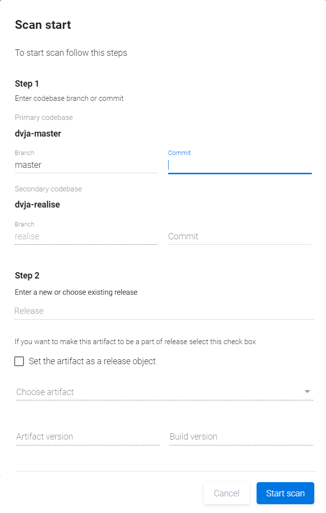 в правом верхнем углу и выберите пункт Start scan в выпадающем меню. - В появившемся окне Scan start в поле Step 1 выберите версию артефакта для сканирования из списка доступных версий в поле Artifact version и версию билда (если применимо) в поле Build version.