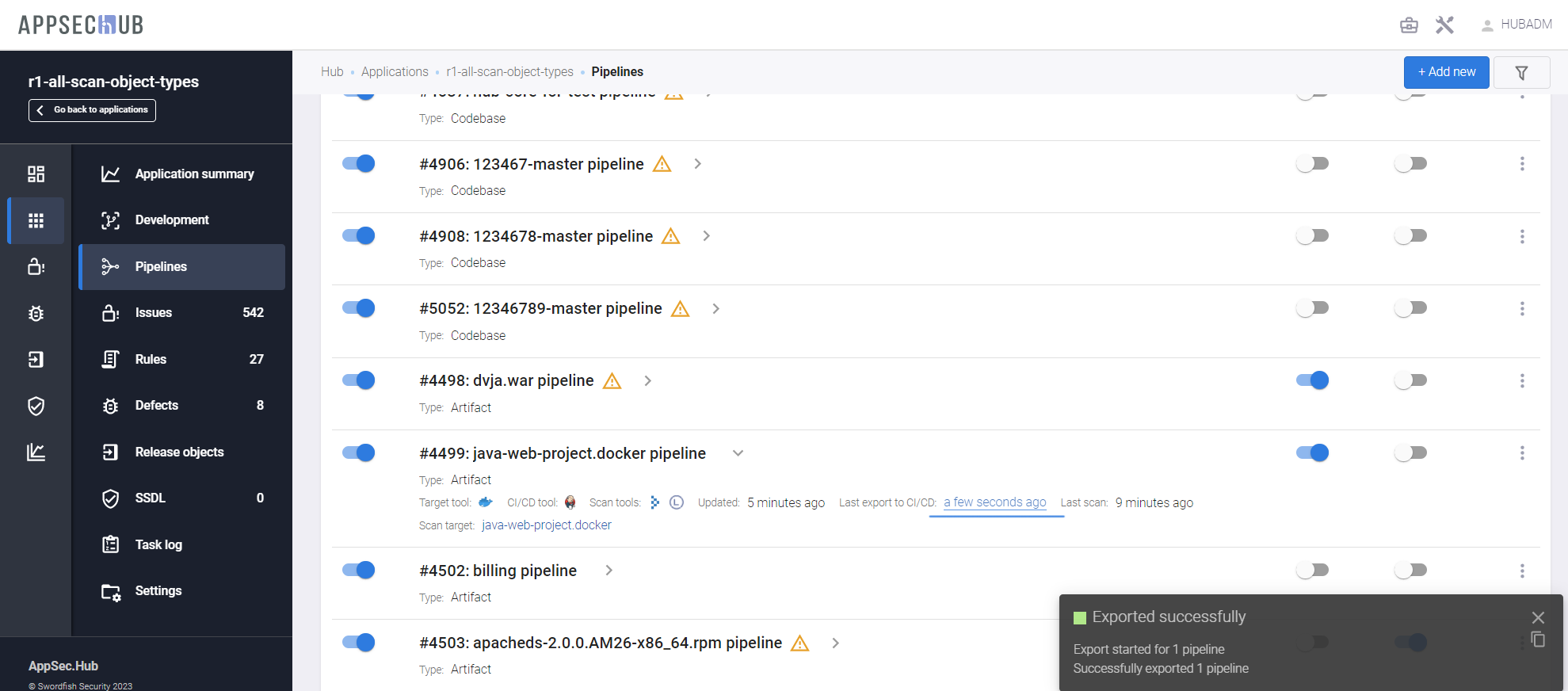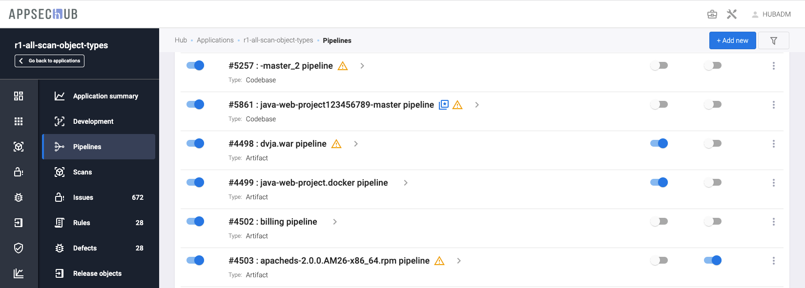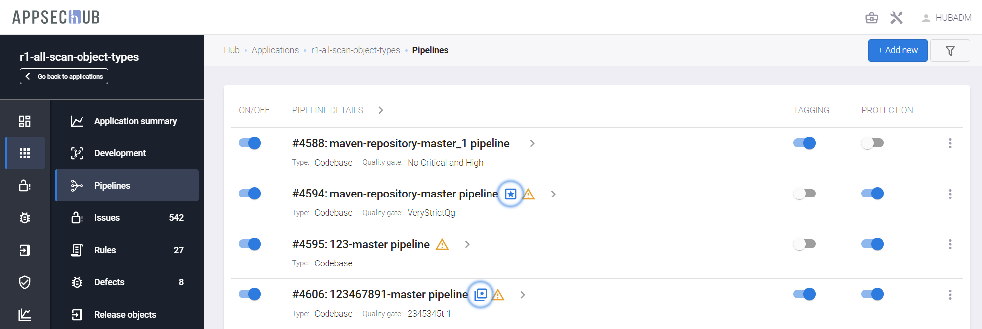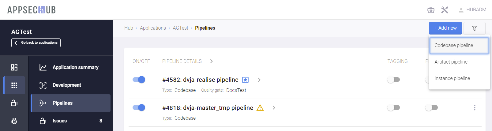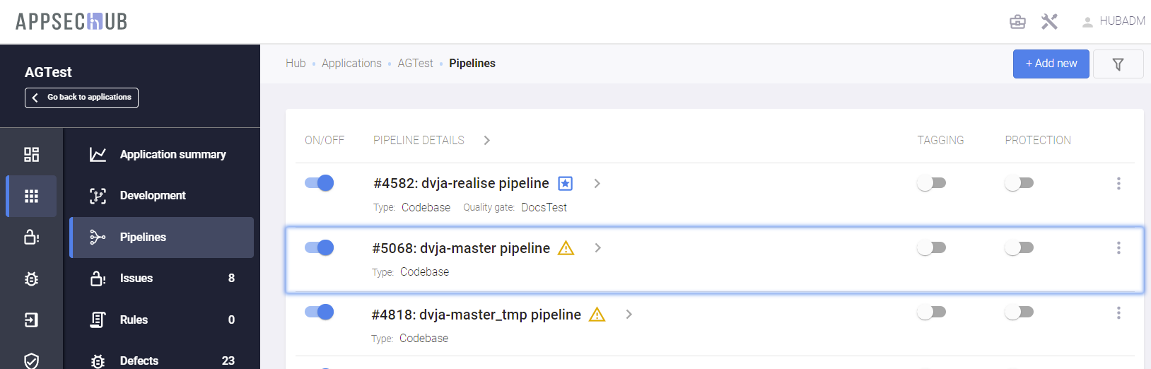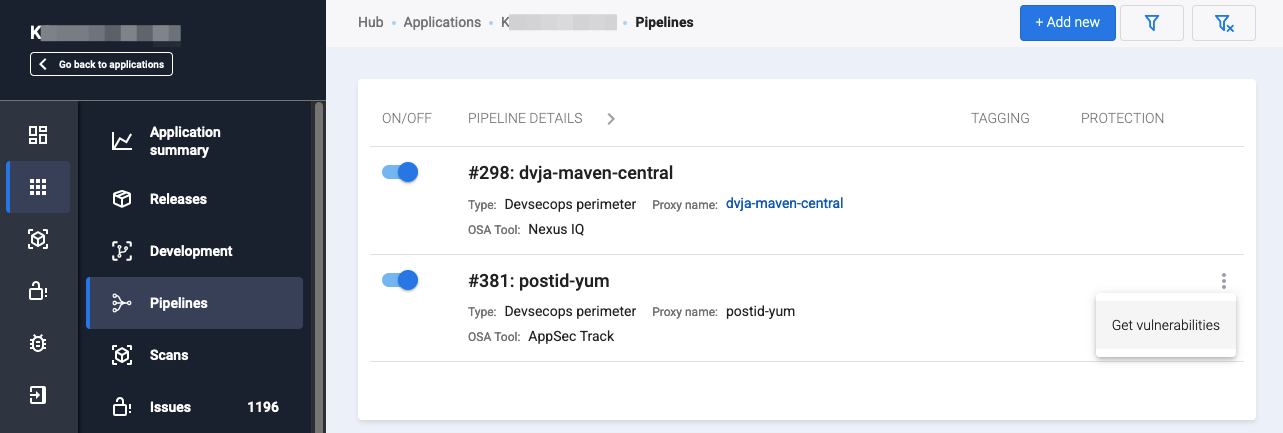 - Pipeline activity — если этот переключатель выключен, пайплайн не может быть запущен на сканирование. Состояние этой настройки пайплайна в AppSec.Hub отображается на странице PIPELINES с помощью переключателя пайплайна (ON/OFF). Если переключатель выключен и имеет серый цвет, пайплайн не может быть запущен на сканирование. Если переключатель включен и имеет синий цвет, пайплайн может быть запущен на сканирование.