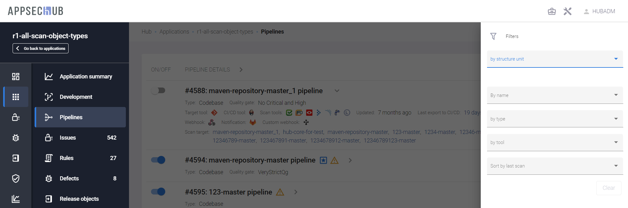 - By type — по типу пайплайна (Codebase, Artifact, Instance, Devsecops perimeter);