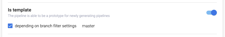 При установке флажка Is template, флажок depending on branch filter settings также установится по умолчанию. В такой конфигурации, при онбординге при попытке создания пайплайна подходящий пайплайн-шаблон будет определяться в первую очередь по наиболее точно подходящему значению фильтра ветвей кодовой базы (Branch filter), и только затем – по значению в поле Build tool. Если флажок depending on branch filter settings не установлен, поиск пайплайна-шаблона будет производиться только по значению в поле Build tool, без учета значения Branch filter.