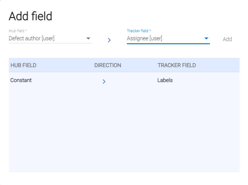 Перед каждой синхронизацией дефектов с Jira необходимо последовательно соблюдать соответствие установленному фильтру и проставлять на все новые дефекты безопасности в AppSec.Hub метку y-demo. Такое действие может быть автоматически задано в настройках в разделе Field mapping на вкладке Defect Tracking. Нажмите кнопку +Add new и выберите значение Constant в выпадающем меню Hub field, значение Labels [value] в выпадающем меню Tracker field, введите значение y-demo в поле Constant и нажмите кнопку Add справа.