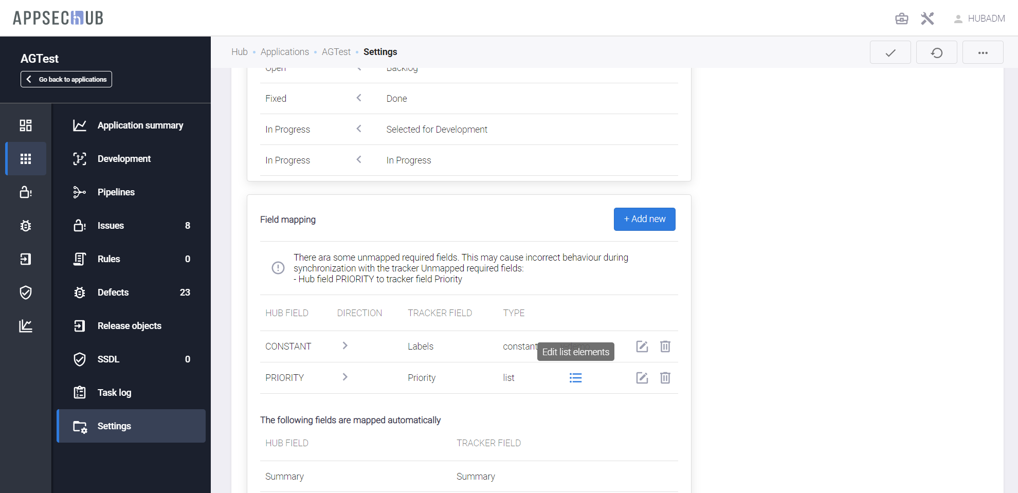 Например, для проекта в Jira требуется определение приоритета дефекта. В этом случае необходимо сопоставить приоритет дефектов в AppSec.Hub с приоритетом дефектов в Jira. Нажмите кнопку +Add new и выберите значение Priority [list] в выпадающем меню Hub field, значение Priority [list] в выпадающем меню Tracker field и нажмите кнопку Add. В результате создастся новое правило сопоставления полей, которое отображается в разделе Field mapping.