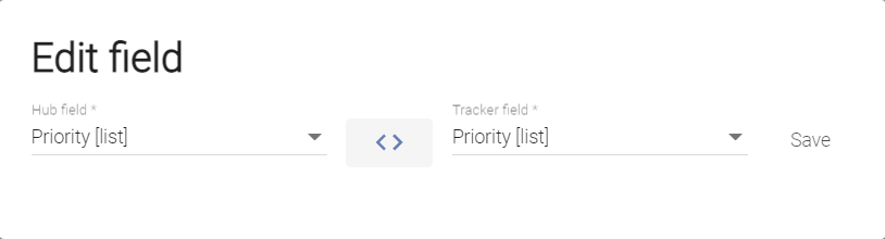 Нажмите иконку редактирования , расположенную в строке справа, чтобы изменить синхронизацию на двунаправленную. Появится окно редактирования поля Edit field. В этом окне несколько раз нажмите на указатель направления > между полями Hub field и Tracker field. Значок направления при этом меняется между знаками однонаправленной синхронизации > и <, и знаком двунаправленной синхронизации <>.
