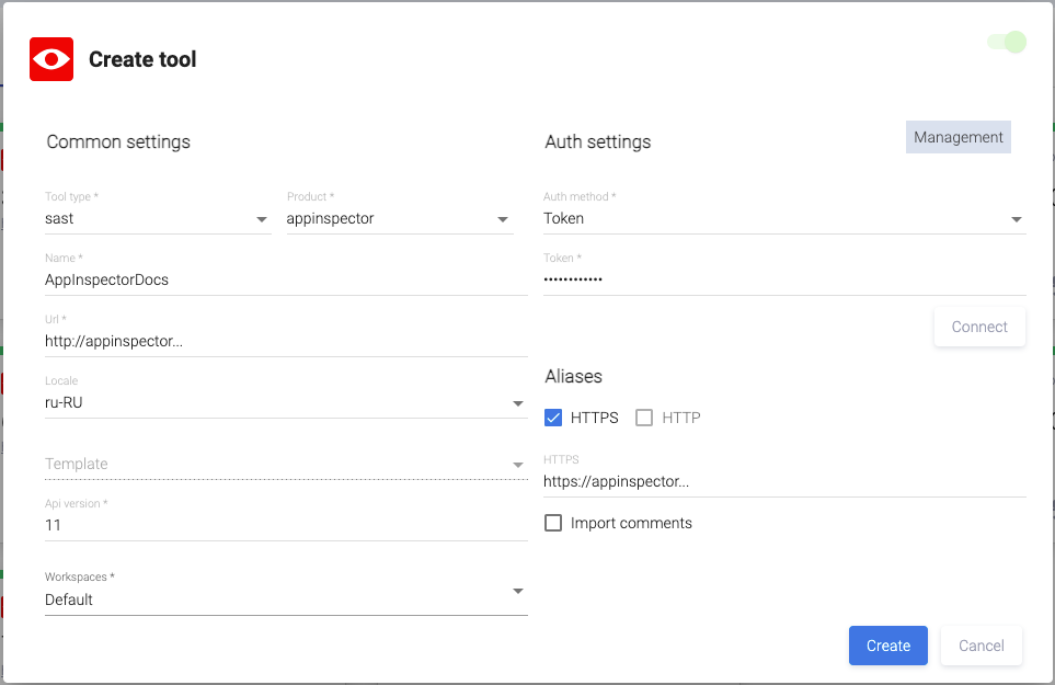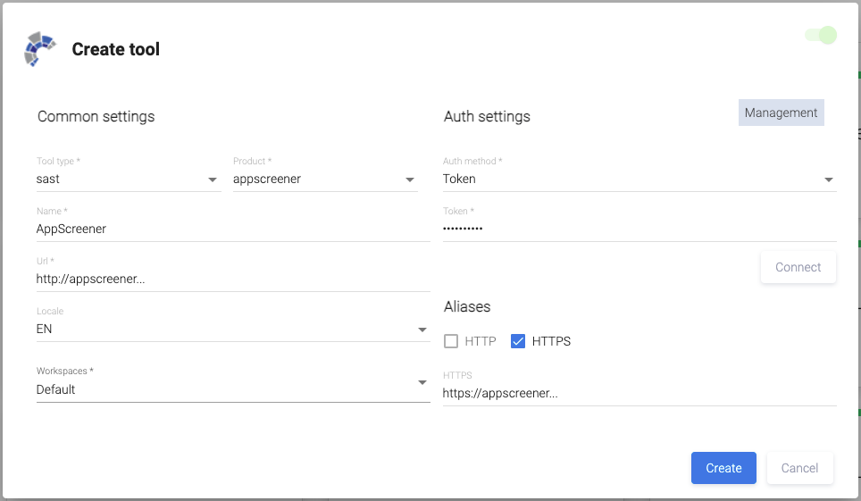 В раскрывающемся меню поля Tool type открывшегося диалогового окна Create tool выберите пункт sast, а в поле Product — appscreener.