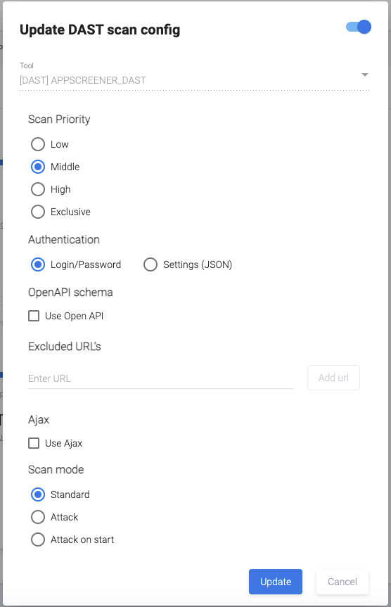 - Флаг Enable autoupdate policy name позволяет включить автоматическое обновление политик в AppSec.Hub в случае изменения названия политик в CodeScoring. По умолчанию и для всех ранее созданных инструментов CodeScoring флаг не установлен. При установленном флаге названия политик будут обновляться после проведения повторного сканирования и при ручном импорте всех уязвимостей. Установка флага может привести к увеличению времени импорта уязвимостей из CodeScoring.