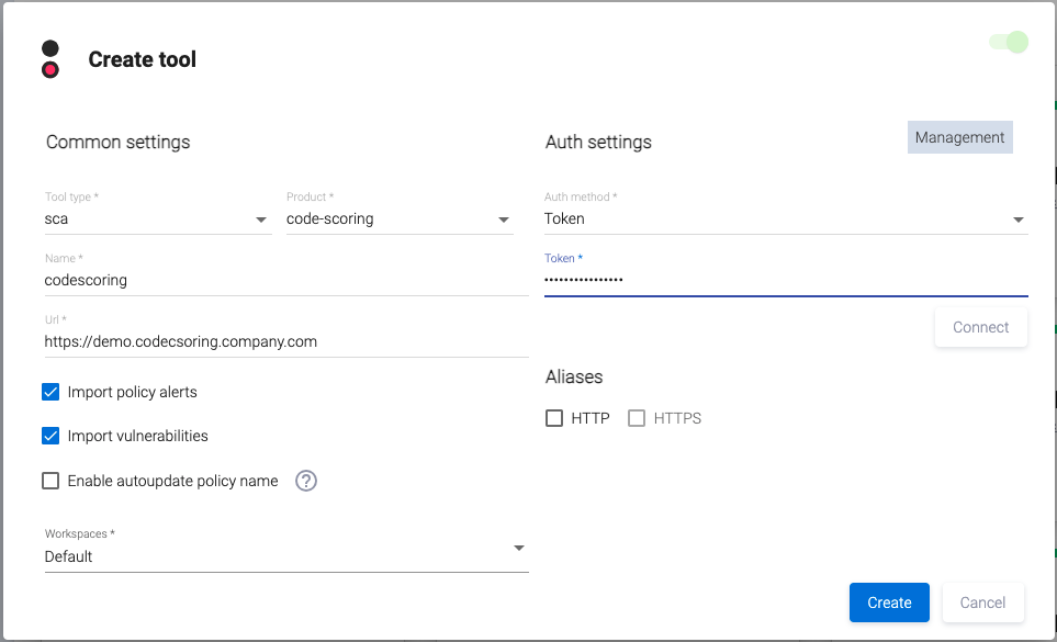 В раскрывающемся меню поля Tool type открывшегося диалогового окна Create tool выберите пункт sca, а в поле Product — code-scoring.