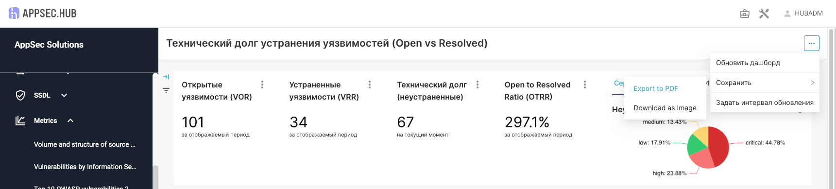 - Серьезность уязвимости – состояние суммарного технического долга в разработке продуктов с течением времени с данными по устраненным и открытым уязвимостям с разбивкой по критичности.