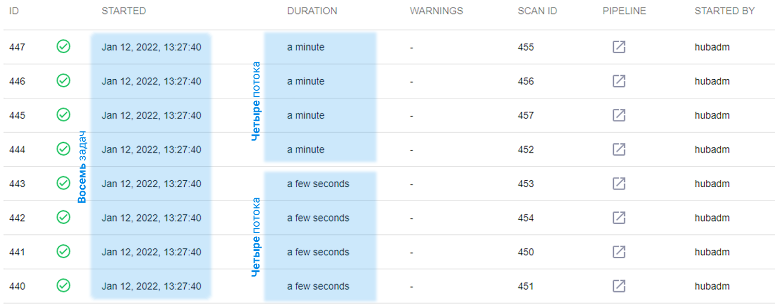 Чтобы продемонстрировать влияние данных параметров на характер импорта, установим для первого параметра значение 8, а для второго - 4. При одновременном запуске большого количества задач импорта можно заметить, что восемь задач импорта были запущены одновременно, но поскольку количество потоков ограничено вторым параметром до четырех, задачи выполняются последовательно по мере появления новых свободных потоков (в нашем примере по четыре). Соответственно, продолжительность выполнения этих задач разная, см. колонку Duration.