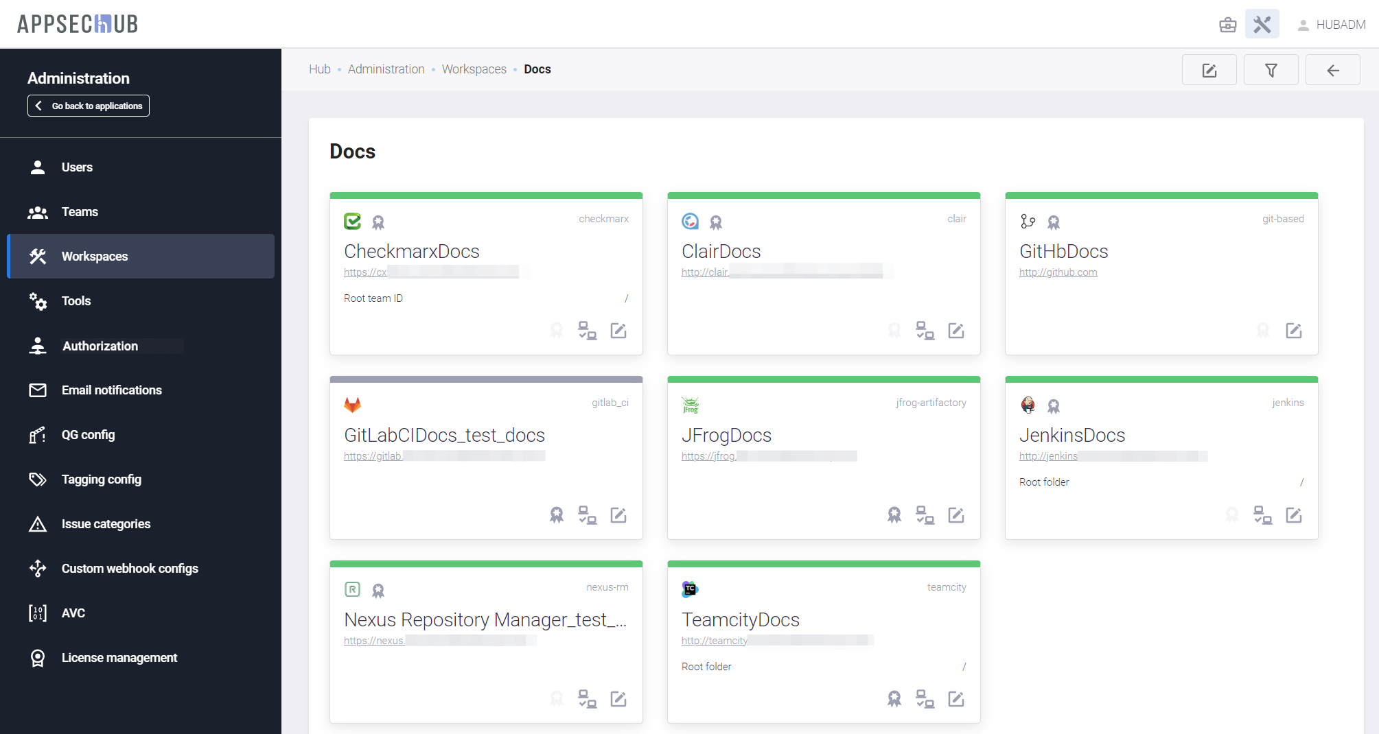 Нажмите на иконку администрирования в правом верхнем углу. На открывшейся странице администрирования выберите пункт меню Workspaces.