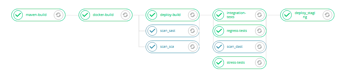 Общий принцип работы данных модулей можно проиллюстрировать с помощью следующего примера. На рисунке ниже показан пример инженерного пайплайна для приложения с добавленными в него с помощью скриптов AppSec.Hub сканированиями безопасности SAST, SCA и DAST. Они выделены на рисунке синим цветом. В результате этой модификации инженерный пайплайн превращается в пайплайн ИБ.