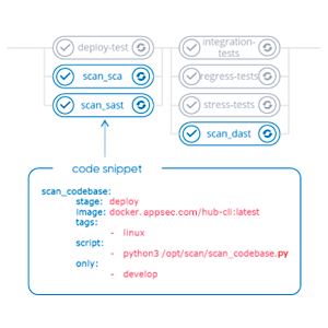 Такие фрагменты кода вызывают модули scan_codebase, и/или scan_artifact, и/или scan_instance, которые подбирают и задают необходимые конфигурации пайплайнов ИБ. С помощью встроенного фрагмента кода инструмент оркестрации может автоматически запустить пайплайн ИБ, настроенный в AppSec.Hub. Инструмент оркестрации запускает все инструменты разработки ПО и инструменты сканирования, заданные в пайплайне ИБ, и затем отправляет результаты в AppSec.Hub.