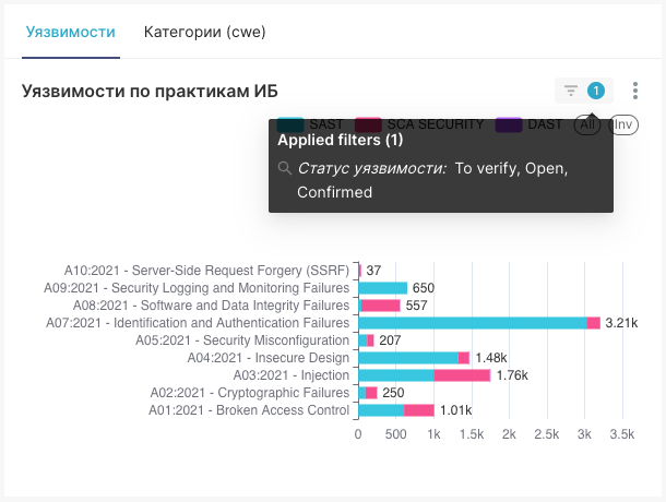 - Уязвимости по практикам ИБ – количество обнаруженных уязвимостей с разбивкой по практикам тестирования безопасности.