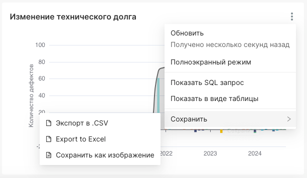 - Сохранить дашборд в формате PDF или JPEG, выбрав соответствующий подпункт меню.