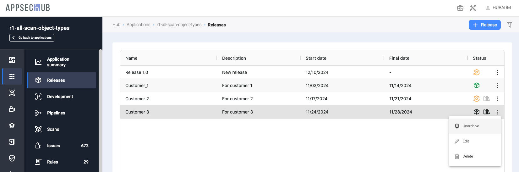 . У архивных релизов нельзя менять статус из Open в Released и наоборот. Архивные релизы нельзя указывать при сканировании, импорте проблем безопасности и прочих действиях в системе, в которых можно задавать релиз в качестве параметра.